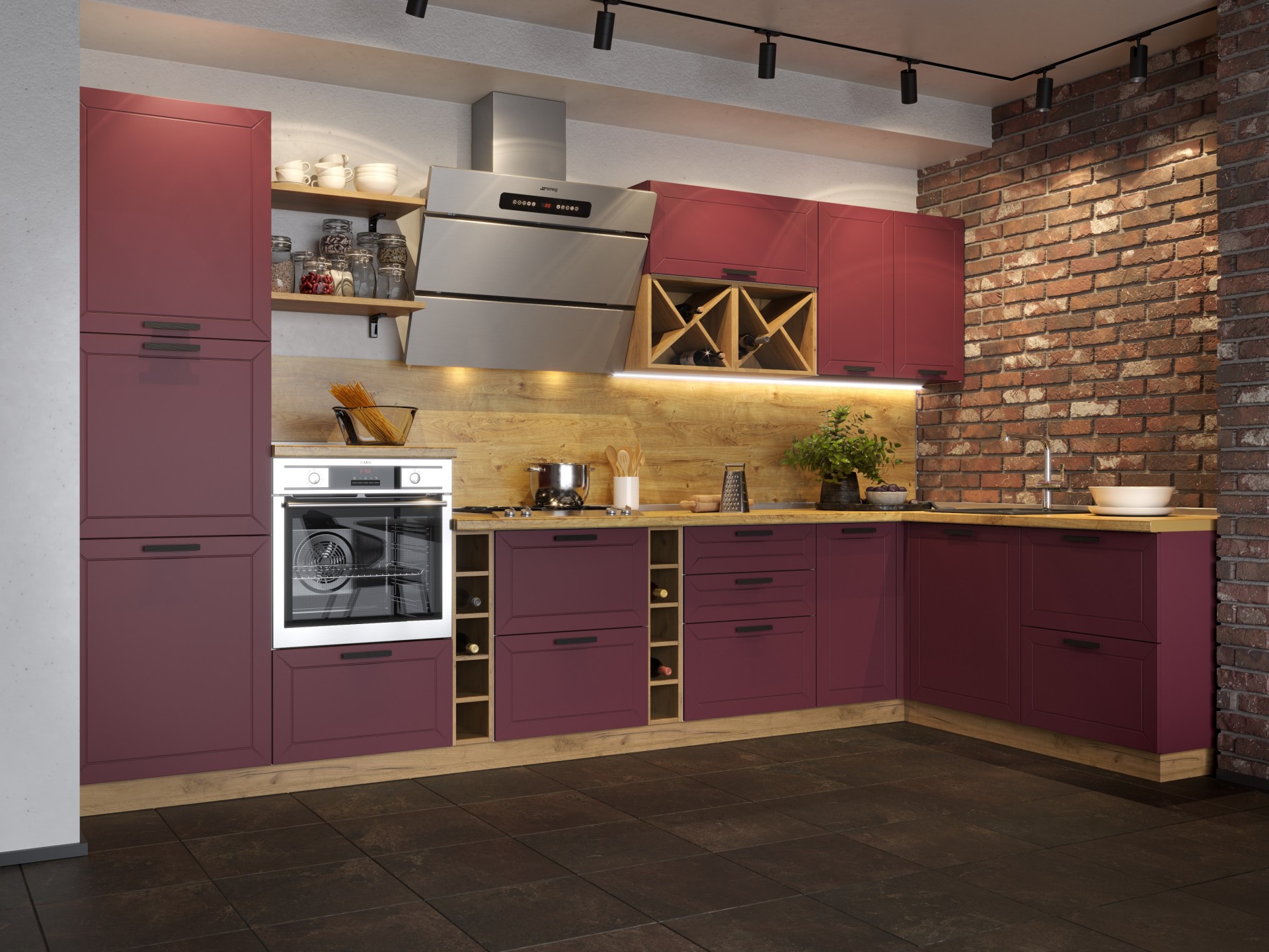 Детали корпуса изготовлены из ЛДСП толщиной 16 мм с использованием кромки 0,4 мм.Фасады выполнены из фрезерованного ЛМДФ толщиной 16 мм облицованного пленкой ПВХ. Модули с ящиками комплектуются шариковыми направляющими полного выдвижения. Цена на кухню указана без учета стоимости столешницы, стеновой панели, мойки и сушки для посуды, техники.
