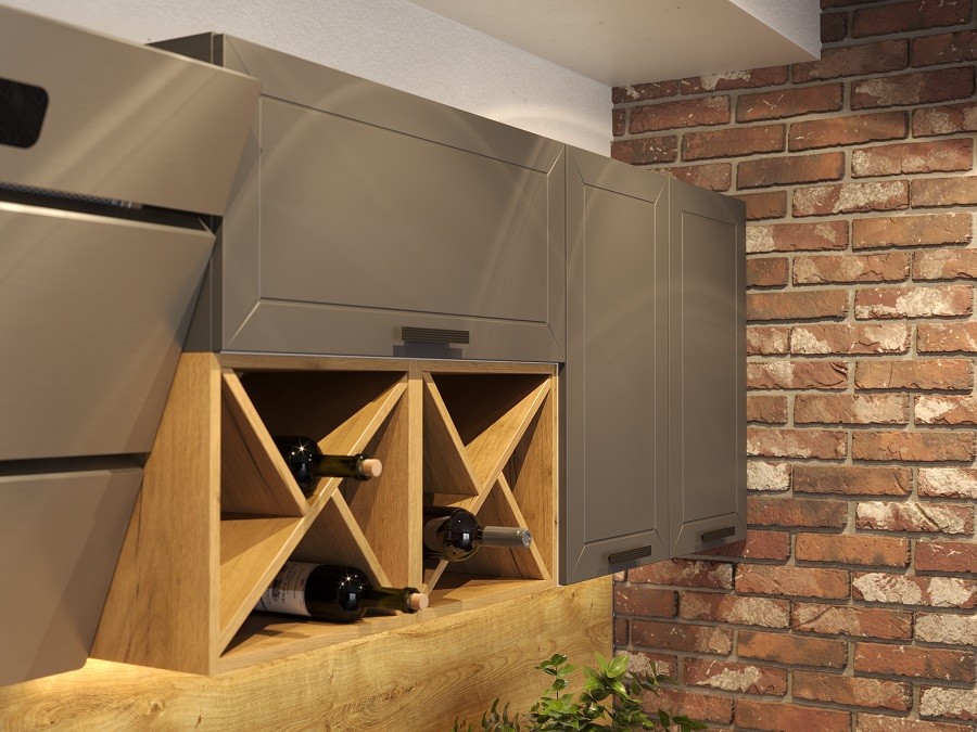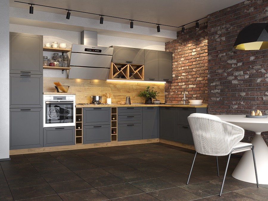 Детали корпуса изготовлены из ЛДСП толщиной 16 мм с использованием кромки 0,4 мм.Фасады выполнены из фрезерованного ЛМДФ толщиной 16 мм облицованного пленкой ПВХ. Модули с ящиками комплектуются шариковыми направляющими полного выдвижения. Цена на кухню указана без учета стоимости столешницы, стеновой панели, мойки и сушки для посуды, техники.
