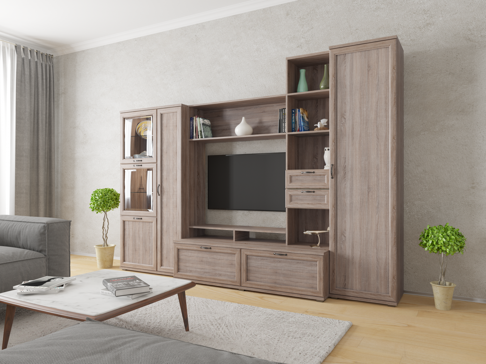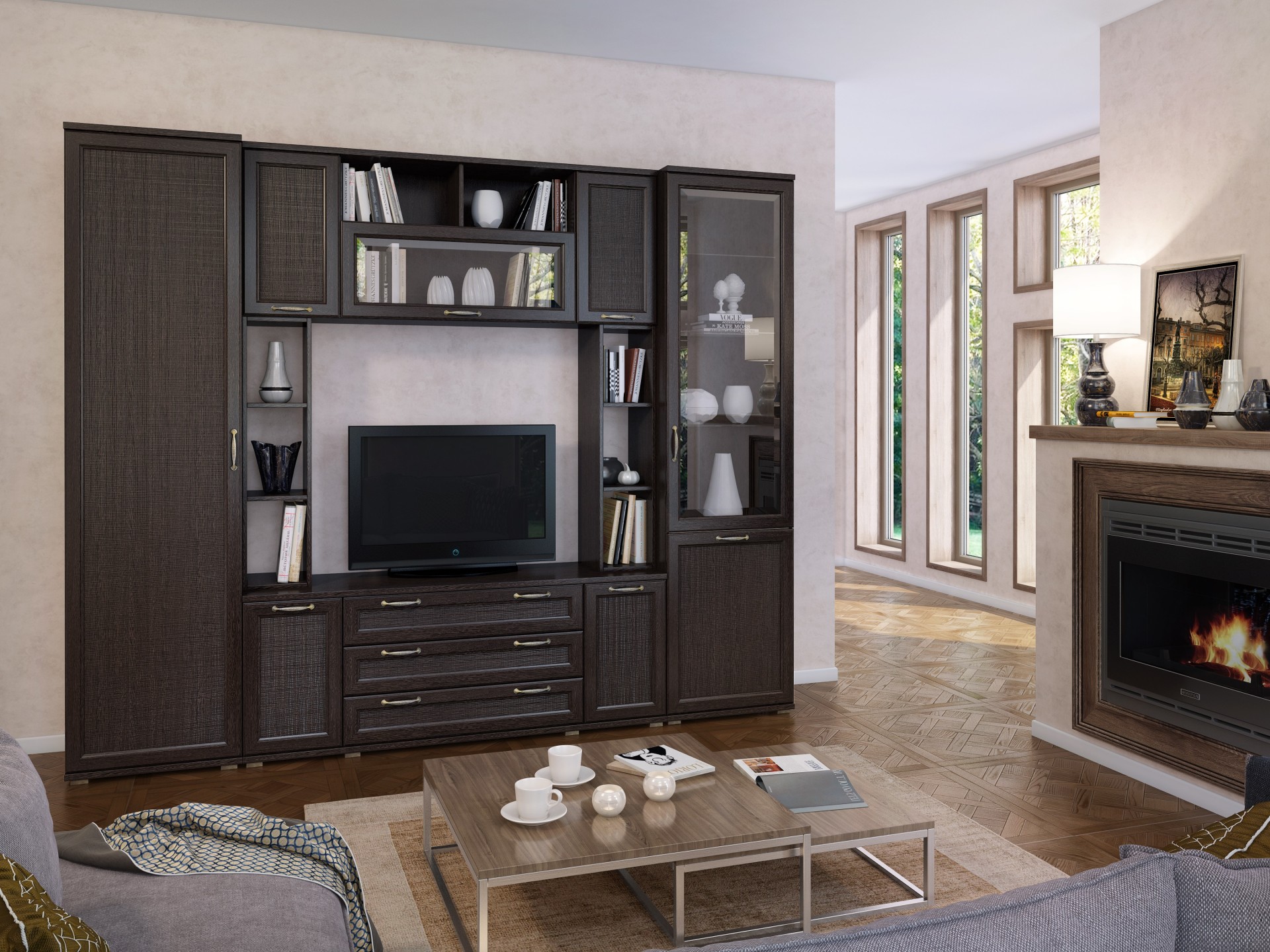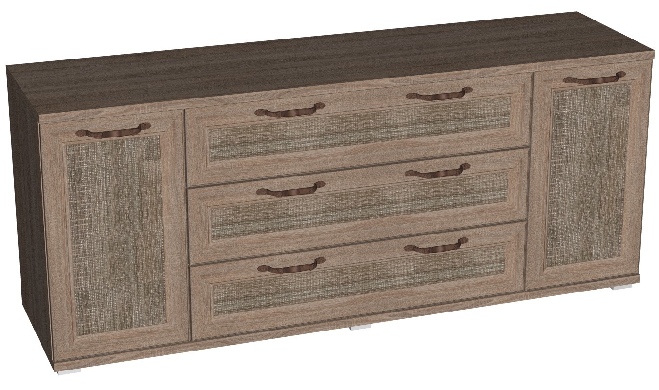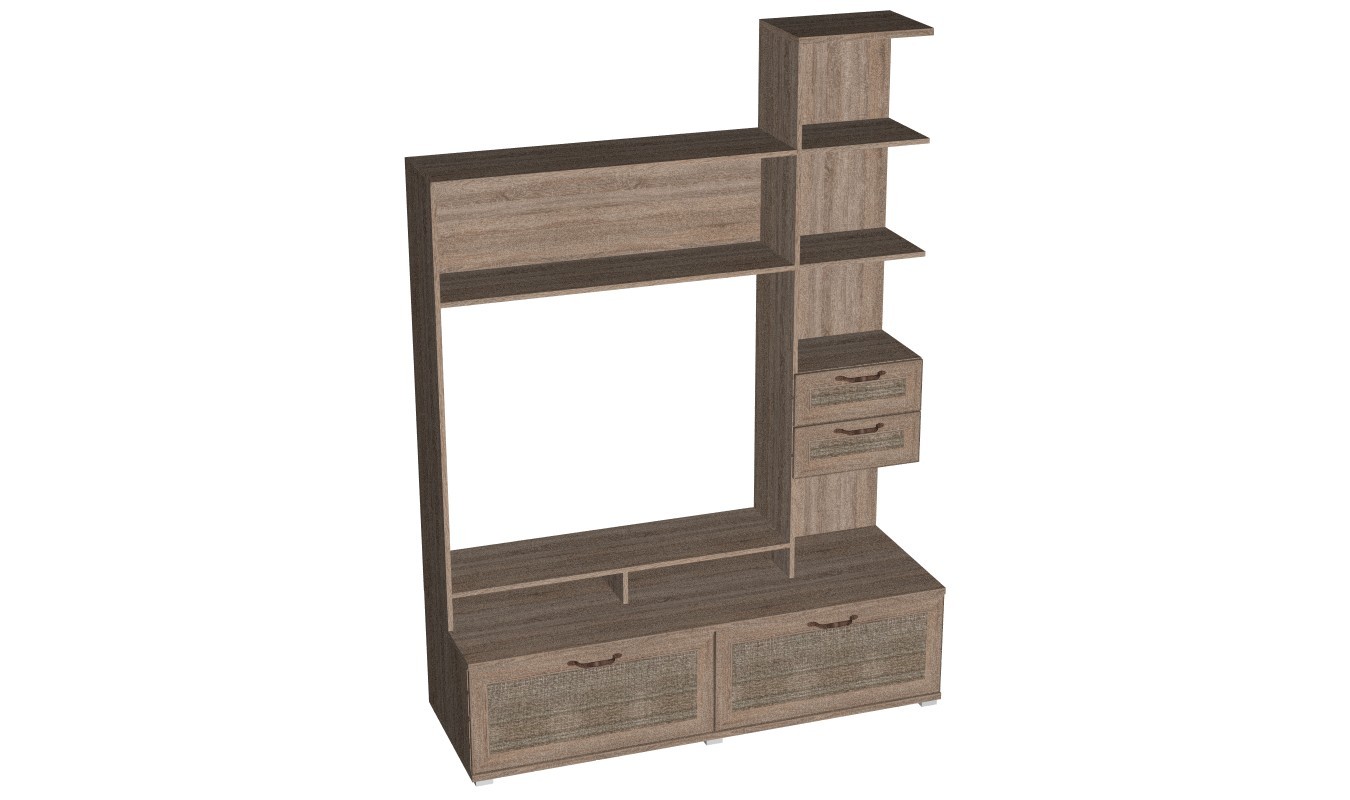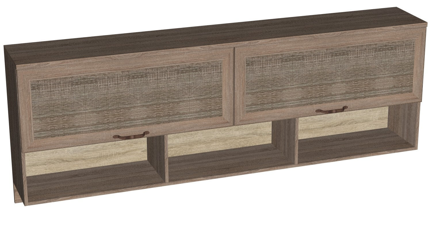 Детали корпуса изготовлены из ЛДСП толщиной 16 мм и 22 мм с использованием кромки 0,4 и 2,0 мм. Фасады выполнены из профиля МДФ толщиной 18 мм в сочетании с ЛМДФ толщиной 6 мм. Модули с ящиками комплектуются шариковыми направляющими полного выдвижения. Петли фирмы Titus.
