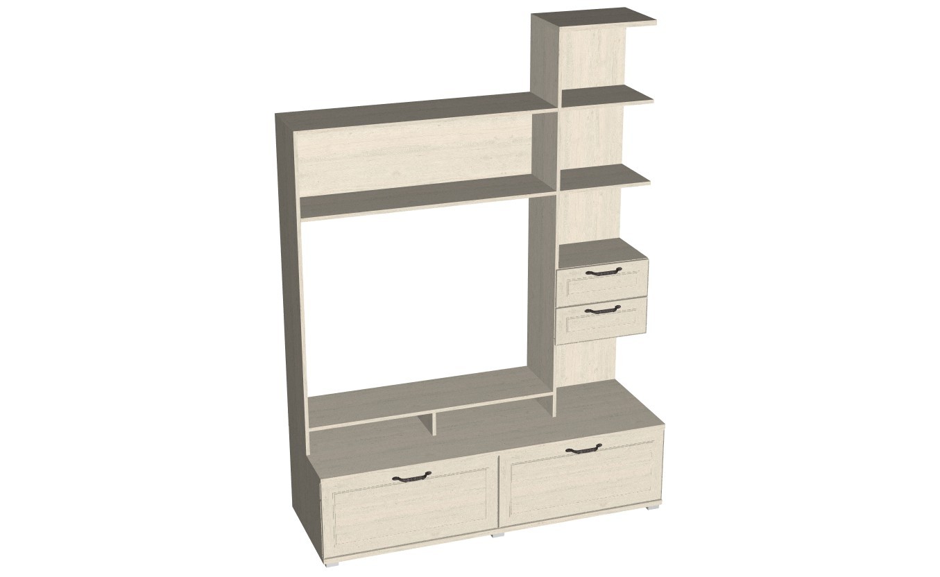 Детали корпуса изготовлены из ЛДСП толщиной 16 мм и 22 мм с использованием кромки 0,4 и 2,0 мм. Фасады выполнены из профиля МДФ толщиной 18 мм в сочетании с ЛМДФ толщиной 6 мм. Модули с ящиками комплектуются шариковыми направляющими полного выдвижения. Петли фирмы Titus.